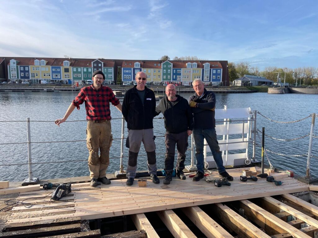 (Op de foto rechts drie bemanningsleden (Ton, Hans en Frank) op een nieuw stuk dek onder leiding van de medewerker van firma Blok)